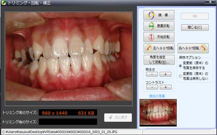 トリミング・回転・補正 画面 ・・・鏡像にしたり、明るさを変更したりして、保存することができます。