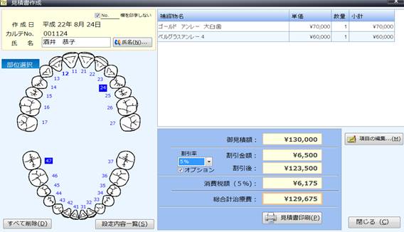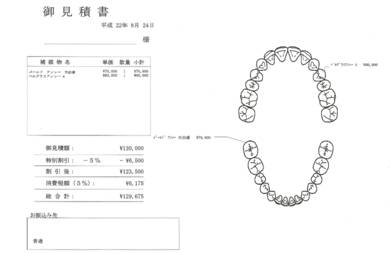見積書の印刷 ・・・治療前に患者様にご説明する際、ご使用頂けます。 お振込先の記載も可能です。